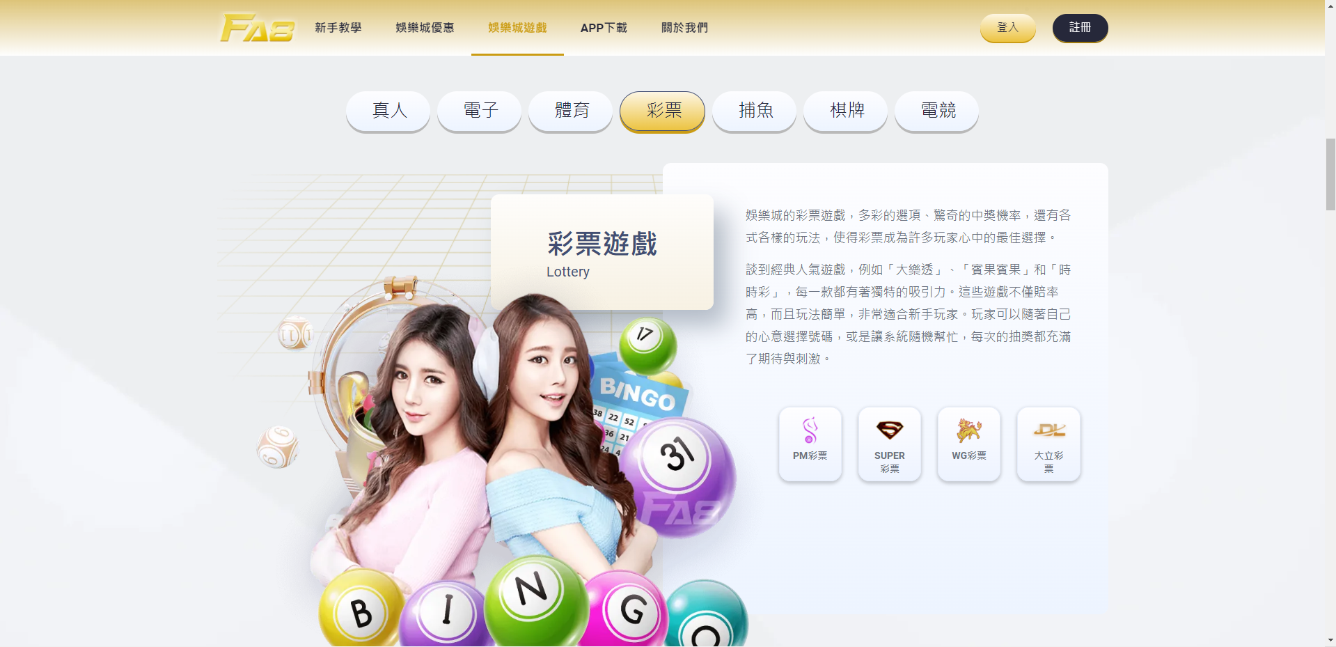 終於有抽獎遊戲了! FA8娛樂城擁有大理彩券、超級彩券、新寶彩券三大彩券平台,足以讓玩家享受玩小賭大的刺激。對了,FA8娛樂城還開通了電競博彩。電子競技博彩平台是泛亞電子競技。